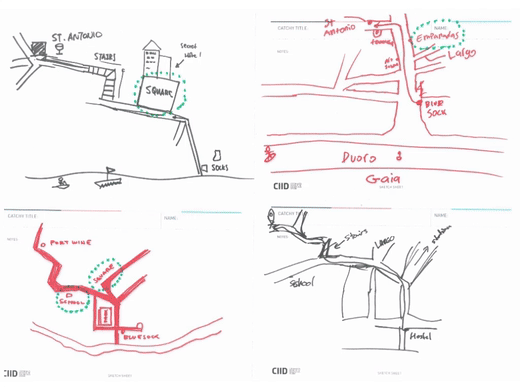 Navigation is a very subjective experience and I was curious to learn how people perceive urban geographies around them. So, I invited 16 of my classmates for a short workshop to see how each of them expressed their experience of a space. Our class had recently spent two weeks in Porto for an industry project, and using that experience as our common ground I conducted the workshop. My participants were asked to draw their mental map from our hostel to a snack bar that was a favourite amongst practically every one.