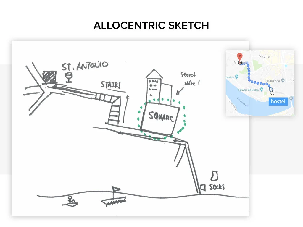How often have we noticed others or ourselves rotating the map to make it align with the direction of travel? While doing so make’s it easier on our cognition to think of directions aligned with our perspective (egocentric), doing so does not contribute towards our mental map of the space around us.