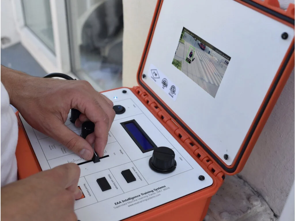 City infrastructures break all the time. The smart surveillance camera is no exception. The SMLT-3607A helps the city maintenance person fix and retrain misbehaving surveillance cameras. To use the SMLT-3607A a city maintenance person plugs the kit into the camera. He/she would monitor the footage and see what the camera is miss labeling. Then the maintenance person needs to select the class that is being mislabeled. He/she pressed the record example button every time the camera sees the correct person or object or action. The recorded example is then added to the dataset of the algorithm. Eventually, after many correct examples in the dataset, the surveillance camera will be able to identify correctly.