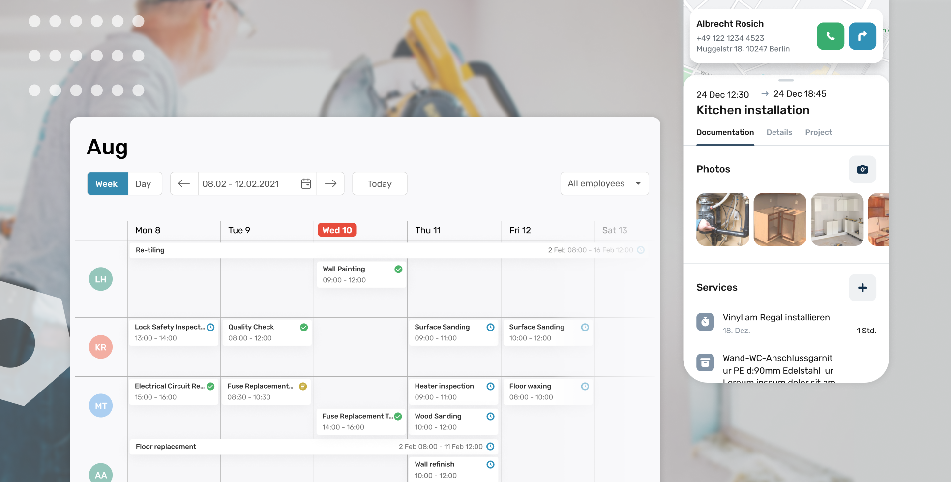 With research and user tests, one of the key areas identified for improvement was the planning flow. The current planning views failed to provide both admins and craftsmen with a clear, organized overview of daily tasks, resulting in confusion, miscommunication, and scheduling conflicts within the team. We redesigned the planning interface on mobile and web to offer a more clear layout and prioritized task visibility.